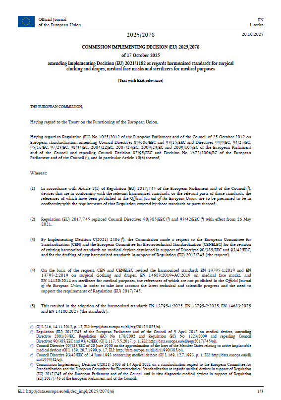 No dia 17 de outubro de 2025, a Comissão Europeia publicou a Decisão de Execução (UE) 2025/2078, que altera a Decisão (UE) 2021/1182 e atualiza as normas harmonizadas aplicáveis a dispositivos médicos.
