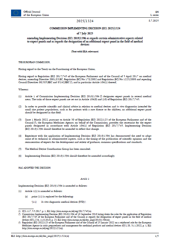 A Comissão Europeia publicou a Decisão de Execução (UE) 2025/1324, que altera a Decisão de Execução (UE) 2019/1396, com vista a melhorar o funcionamento técnico e administrativo dos painéis de peritos designados ao abrigo do MDR e IVDR. Esta atualização introduz ajustes organizacionais, uma nova área de especialização e regras mais claras para a remuneração e coordenação de tarefas científicas.