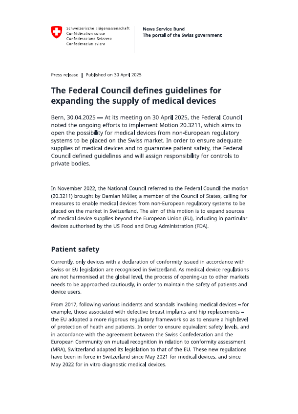 O Conselho Federal da Suíça aprovou recentemente alterações significativas à legislação nacional sobre dispositivos médicos, com o objetivo de reforçar a proteção dos pacientes e alinhar o enquadramento jurídico suíço com os requisitos da União Europeia, apesar de a Suíça não ser atualmente parte do Acordo de Reconhecimento Mútuo (MRA) atualizado com a UE.