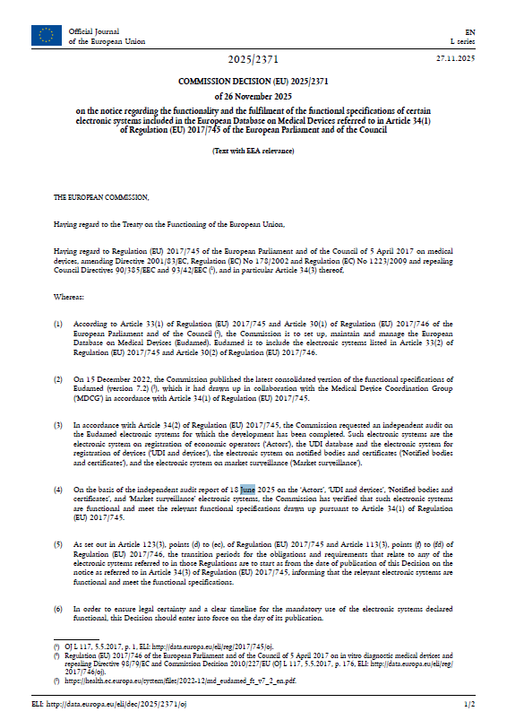 The European Commission has published Commission Decision (EU) 2025/2371, officially confirming that four core electronic systems within EUDAMED are now fully functional and meet all required functional specifications.