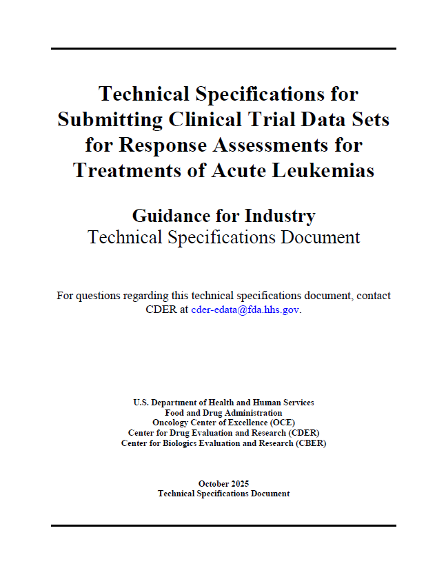 A Food and Drug Administration (FDA) publicou em outubro de 2025 o documento “Technical Specifications for Submitting Clinical Trial Data Sets for Response Assessments for Treatments of Acute Leukemias”, que fornece orientações técnicas atualizadas para a submissão de dados de ensaios clínicos relacionados com tratamentos para leucemias agudas.