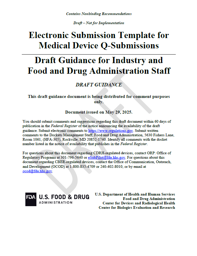 A Food and Drug Administration (FDA) dos Estados Unidos publicou, a 29 de maio de 2025, um projeto de orientação que propõe a adoção obrigatória de um modelo eletrónico estruturado para submissões Q-Submission — com destaque para as Pre-Submissions no contexto dos dispositivos médicos.