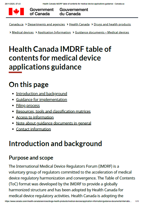 Health Canada has officially adopted the International Medical Device Regulators Forum (IMDRF) Table of Contents (ToC) format for medical device submissions. This move supports global regulatory convergence and aims to reduce both time and cost for manufacturers and regulators.