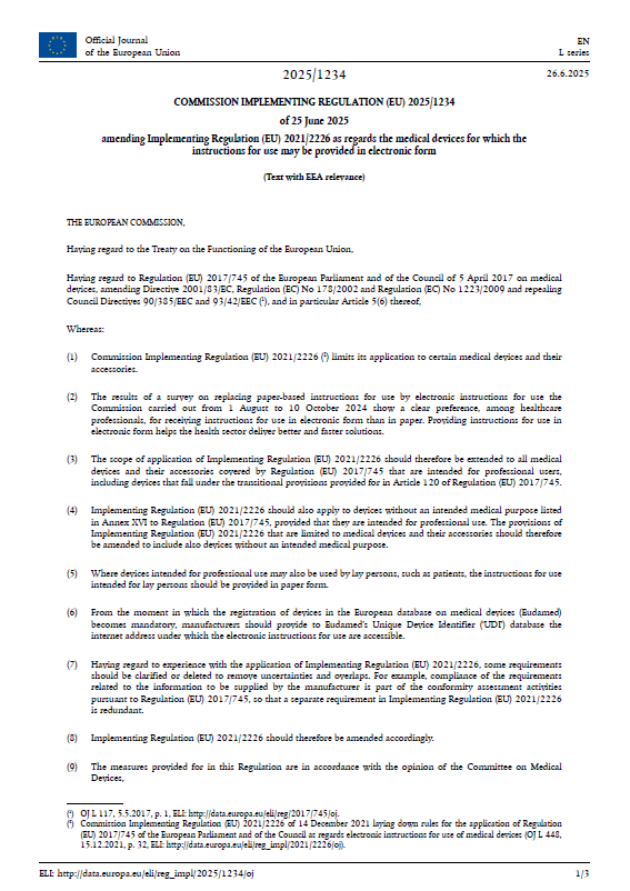 No dia 25 de junho de 2025, foi publicado o Regulamento de Execução (UE) 2025/1234, que altera o Regulamento (UE) 2021/2226 no que respeita aos dispositivos médicos cujas instruções de utilização (IFU) podem ser disponibilizadas em formato eletrónico.