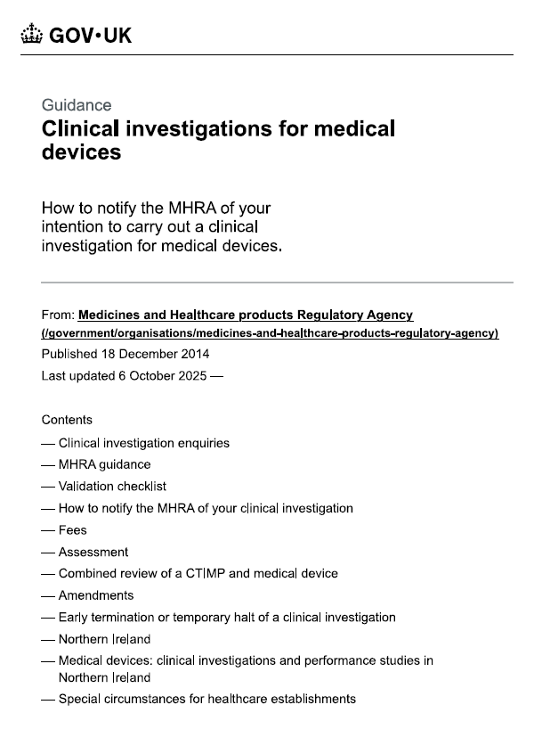 A Medicines and Healthcare products Regulatory Agency (MHRA) publicou uma versão atualizada das suas orientações sobre investigações clínicas de dispositivos médicos, com o objetivo de apoiar fabricantes, promotores e investigadores na preparação e condução de ensaios clínicos no Reino Unido.