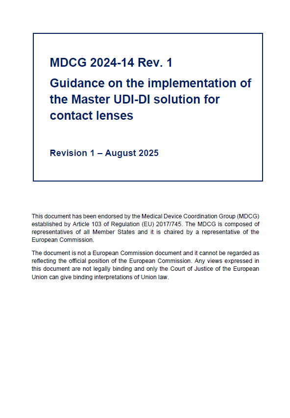 A Medical Device Coordination Group (MDCG) publicou a versão revista do documento MDCG 2024-14 Rev.1, que fornece orientações sobre a implementação do Master UDI-DI para lentes de contacto.