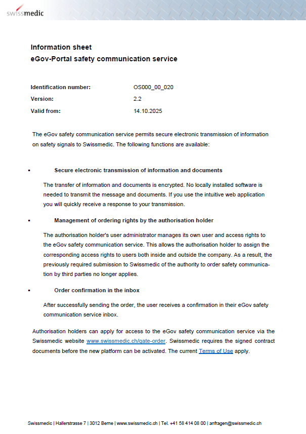 A Swissmedic, autoridade suíça responsável pela supervisão de medicamentos e dispositivos médicos, lançou o novo serviço eletrónico de comunicações de segurança (eGov safety communication service).