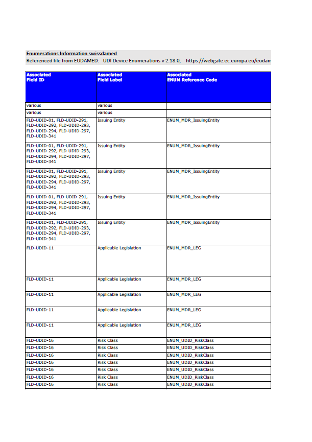 The Swissmedic document compiles enumeration codes linked to specific EUDAMED field IDs. These enumerations are used in multiple regulatory data areas, including: