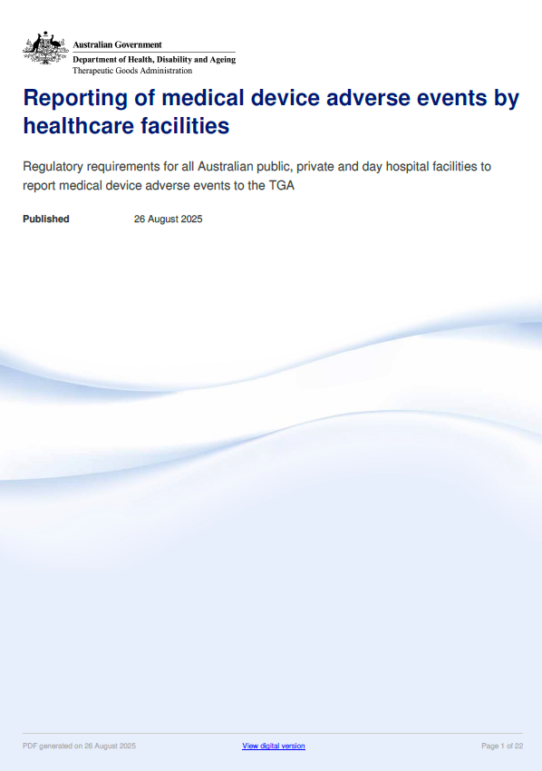 A Therapeutic Goods Administration (TGA), autoridade regulamentar australiana, publicou a versão revista do guia “Reporting of medical device adverse events”, que estabelece as regras e prazos para o reporte de incidentes adversos relacionados com dispositivos médicos.