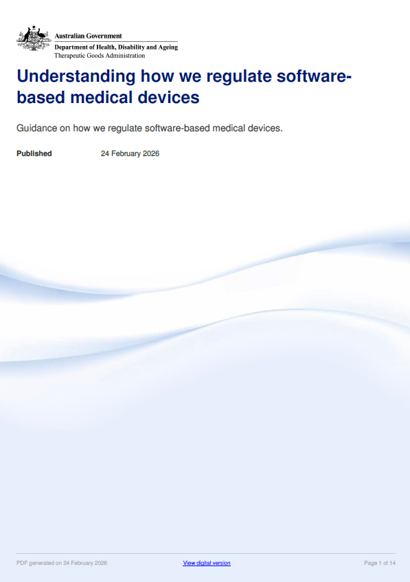On 24 February 2026, the Australian Therapeutic Goods Administration (TGA) published updated guidance titled “Understanding how we regulate software-based medical devices.”